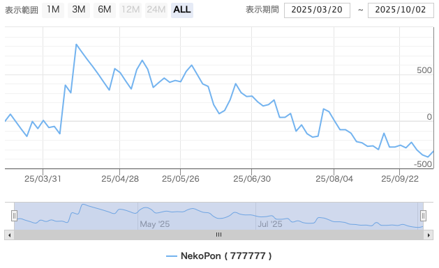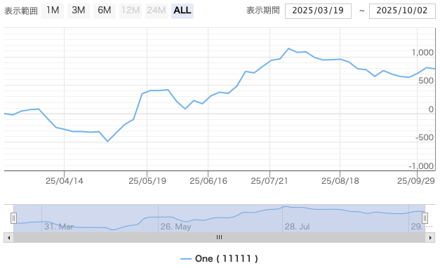 と、思ってチャートを見ても、まあ、そこまで突出した上昇トレンドでもない様子。なんなら、7月の方がでかいトレンドでしたが稼ぎは9月の方が圧倒的に大きかった。