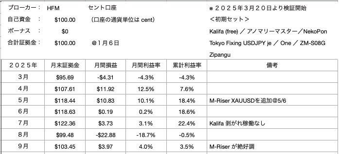 で、9月のMVPは「One」を凌いで「M-Riser XAUUSD」でした。月間利益636セント。小さいですが、証拠金に対する利益率でいえば6%ほどになります。悪くない。ゴールドの相場が突き抜けていたおかげですね、これが続いて欲しい!