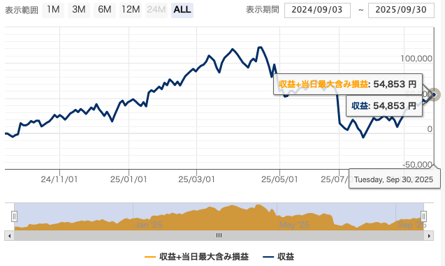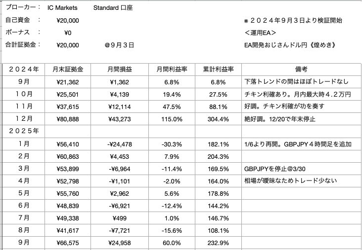 幸い、9月末で稼働停止した同EAの利益は約5万5千円。購入費用はギリギリで取り返しました!プラスで、ここまでのキャッシュバックがこのEAで稼いだ利益として残ります。