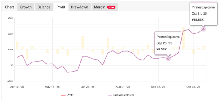 しかし、10月下旬の高市総理指名前後の急落相場はどうだったでしょうか。恐らく、大損失を被ったゴールドEAは多かったのでは。「PiratesExplosive」は上のグラフの通り、微損で済ませてまた利益積み上げに戻っていますね。