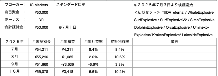 約90Kということは、ざっくり9万円ですね。月初の口座残高が約50万円弱だったので、「WhaleExplosive」だけで15〜20%の月利を出したということになります。ぱっと見、9月の方がすごそうですけど・・。