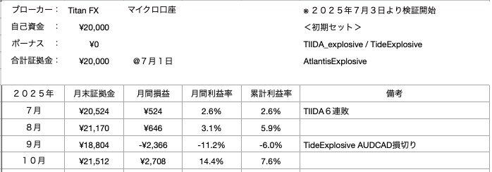 公式では「TideExplosive」「AtlantisExplosive」どちらも大体180ドル前後の月間利益、それぞれ分けた口座で10%弱ですね。素敵。