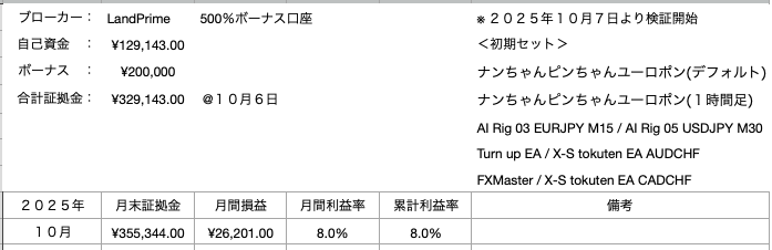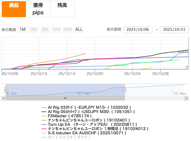 高市総裁選出で押し上げた10月前半のトレンドで大きく勝っている恩恵は、他のゴールドEAも享受していると思います。