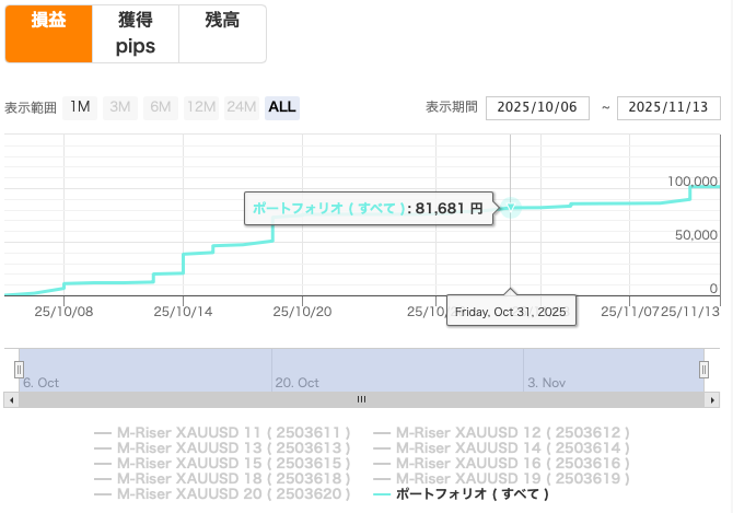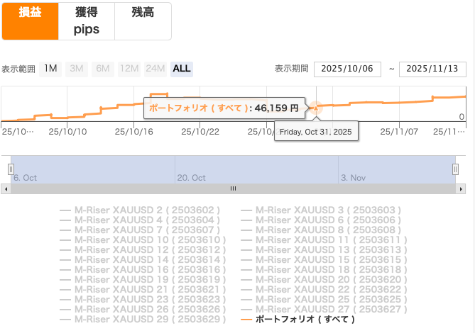 「M-Riser XAUUSD」の第2グループがスゲーと気付いて、10月7日からそこだけ追加。おかげで、口座の残高が過去最高値を突破しました。