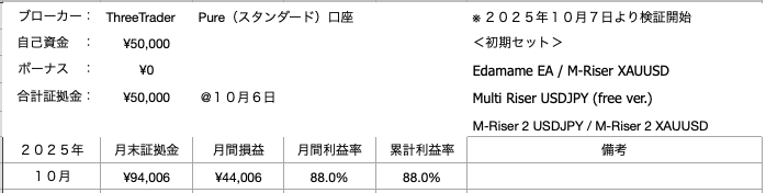 先ほどの「えだまめ × ライザー」の「えだまめEA」を除いたバージョン。つまり、「Multi Riser」の1と2、XAUUSDとUSDJPYのフル稼働ポートフォリオです。