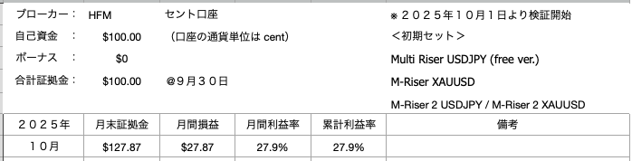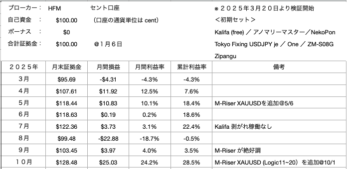 この複利EAポートフォリオの口座は、「ライザー × ライザー」と同じHFMセント口座なんですけど。