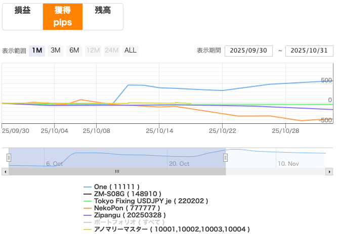 それでもなんやかや、10月下旬の調整相場で利益を貯めて月間収益はプラスで終わることができました。