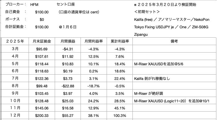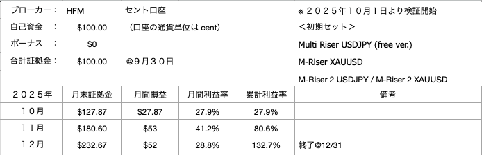 以前からの「Multi Riser」の運用でスプレッド耐性が優秀なことがわかっていたので、スプレッド広めのブローカー HFMにて、キャッシュバック稼ぎ隊としての役割も担っています。