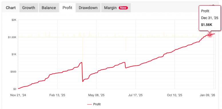 1年1ヶ月ほどの運用で1度だけ損切りにかかっていますが、その後の回復も含め、非常に安定していますね。ナンピン・マーチンEAでこの損益グラフは、とても頼もしい。