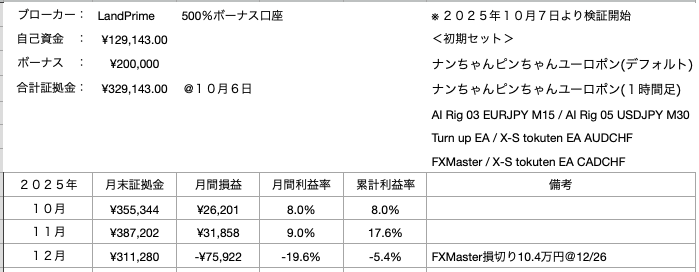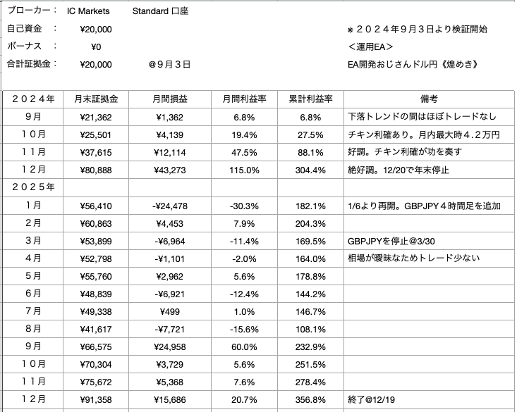 前年9月から1年以上運用してきて、この「おじさんの煌めき」が信頼できる良いEAだということはよくわかりました。1月からは、他のEAと抱き合わせでポートフォリオ化します。