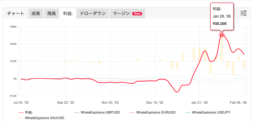 1月のMVPは、順張りスイングEAの「WhaleExplosive」30,250円でした。4通貨ペアで運用しているところ、ほぼほぼ XAUUSD での稼ぎでしたね。
