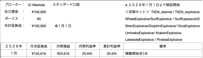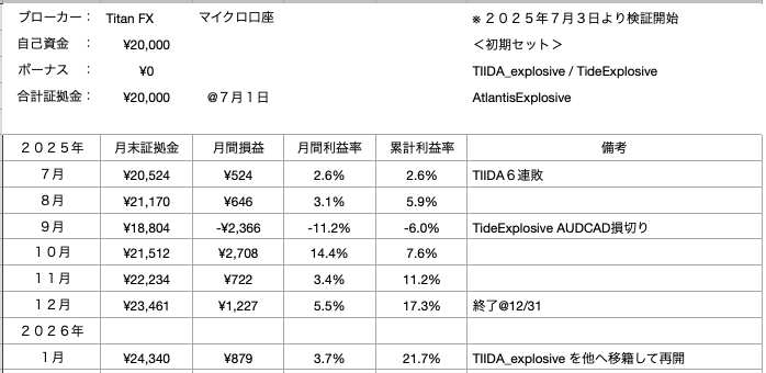 実質として、昨年7月から運用している同口座から「TIIDA_explosive」が抜けただけになったので、口座の収支記録はリセットせずに引き続き継続することにしました。なので、下記の収支記録表は7月からになっています。