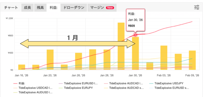 とゆうわけで、1月のMVPは「TideExplosive」の809円!!・・・え、少ないですか?これはマイクロ口座なので、スタンダード口座で運用できる資金がある方は、資金と利益をこれの100倍で考えてください。