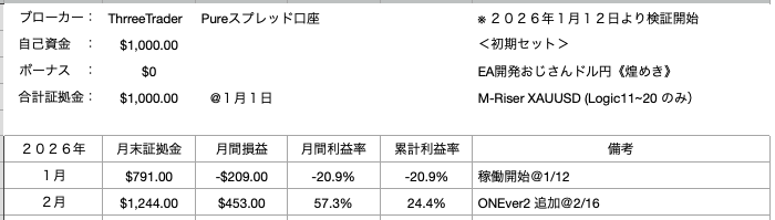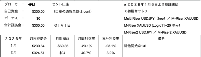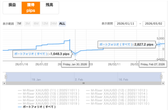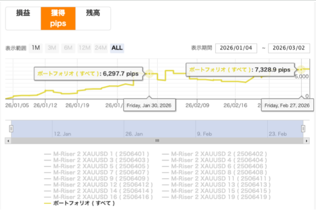 なお、期待の「Multi Riser XAUUSD」第2ロジックだけ抽出してみると2,654pips、6,011セント=60ドルでした。別途追加分の同ロジックを合わせて、2月のポートフォリオをプラス収支に支えてくれました。