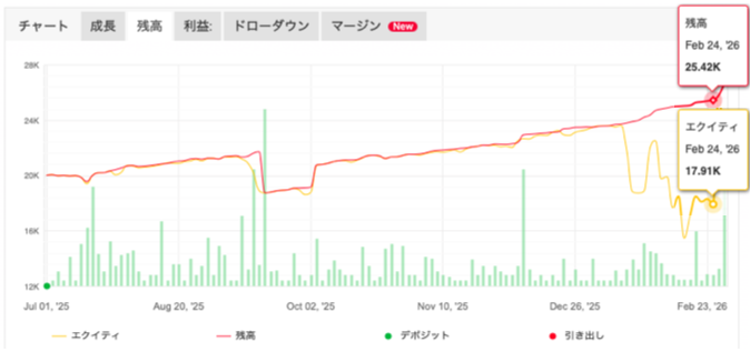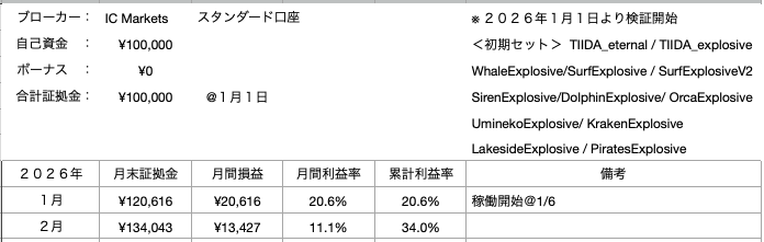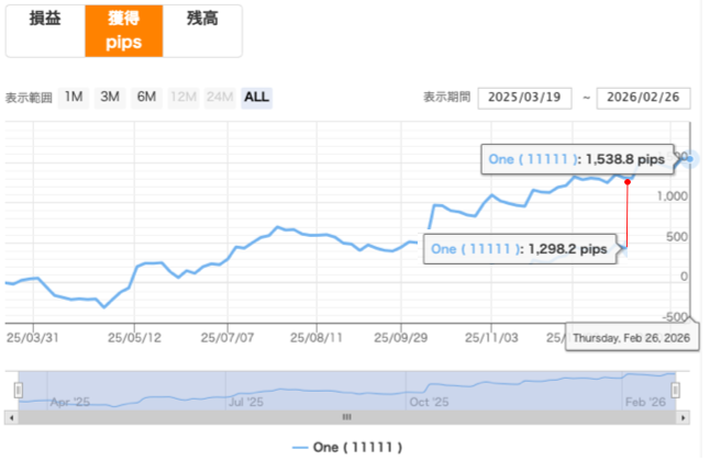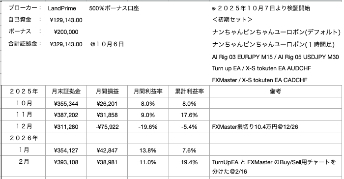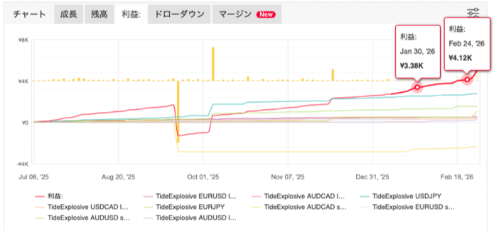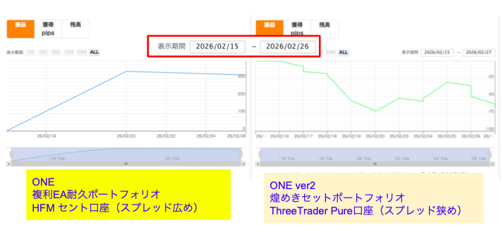 「複利EA耐久ポートフォリオ」の「ONE」は相変わらず好調なのに、こちらの「ONE ver2」は不調。3月の間まで様子を見て、調子が戻らなければ「ONE」との交替を検討します。