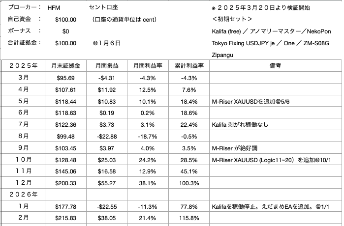 さて。当ポートフォリオ内の2月MVPは「Multi Riser XAUUSD」(第2ロジック限定運用)でした。4,475pips、477ドル。予定調和とはいえ、証拠金ベースでいえば前月末比+57%は嬉しい〜。