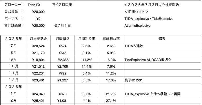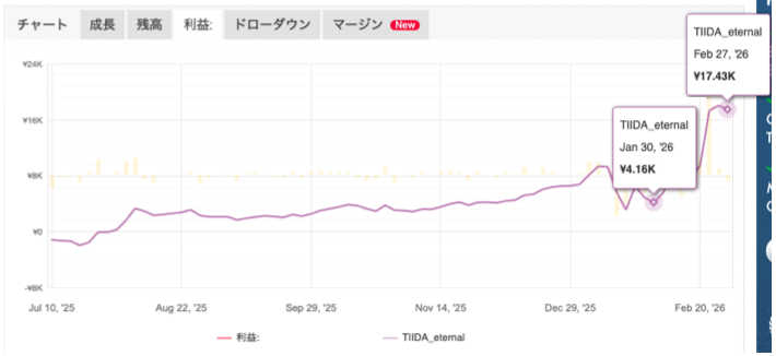 とゆうわけで、2月の月間MVPは〜なんとドル円アノマリーの「TIIDAeternal」13,270円でした。これは、意外。先程までご紹介のいずれのポートフォリオでも、ドル円アノマリーはそんなに伸びていなかったのに。